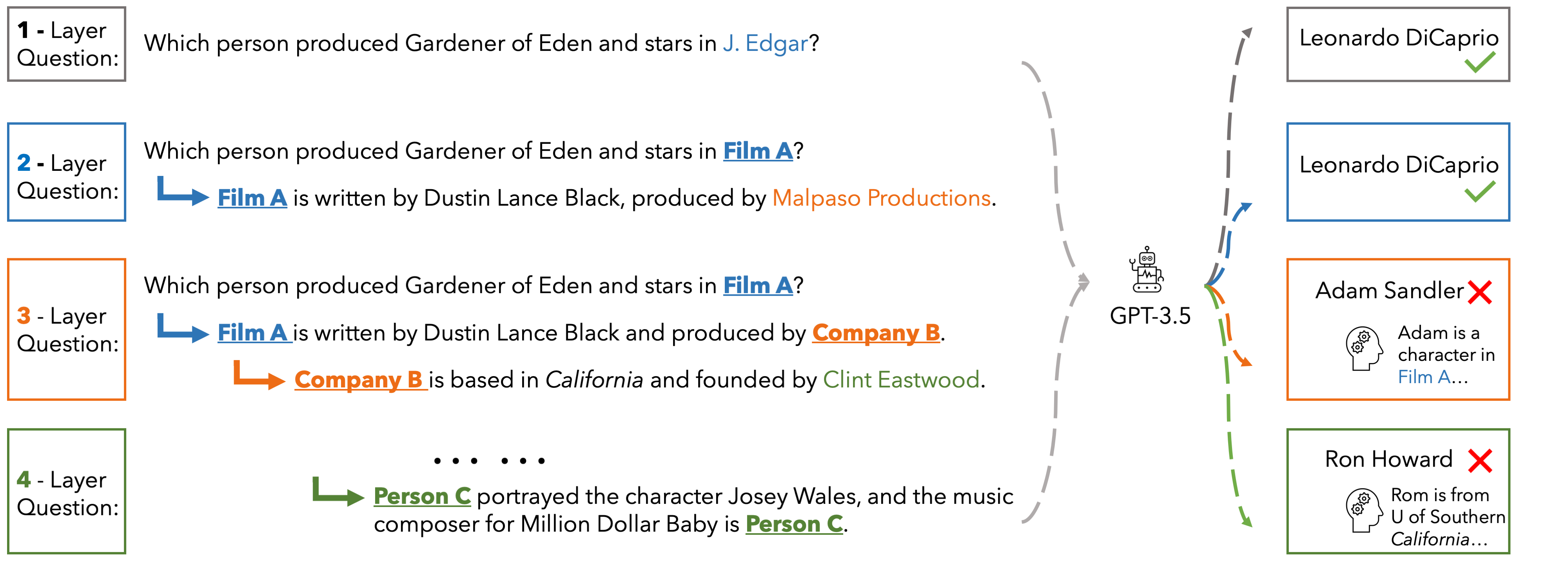 In EUREQA, every question is constructed through an implicit reasoning chain. The chain is constructed by parsing DBPedia. Each layer comprises three components: an entity, a fact about the entity, and a relation between the entity